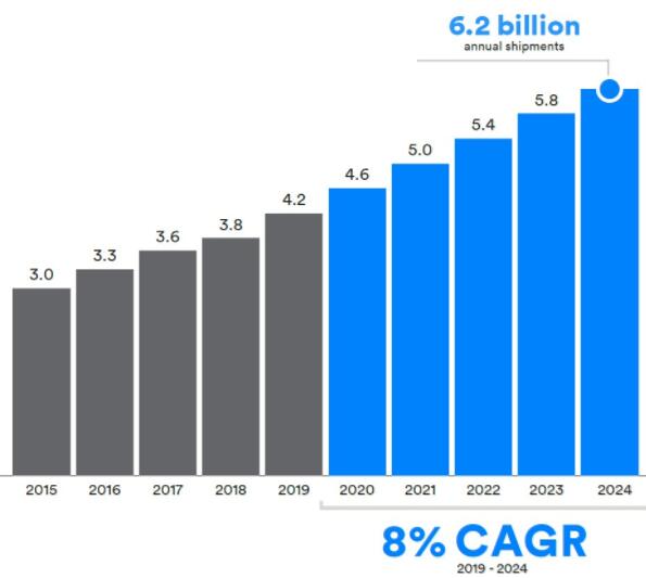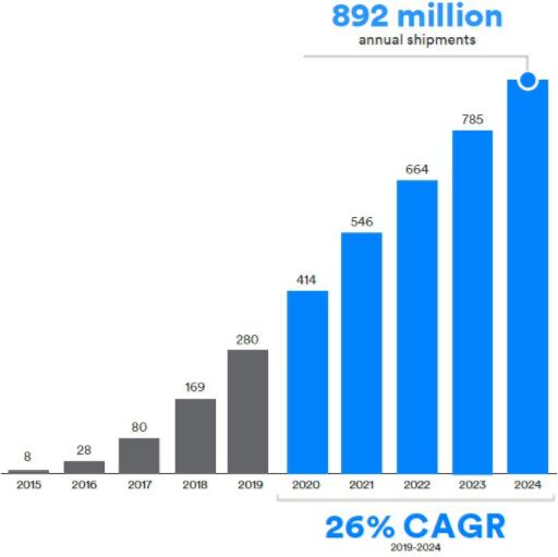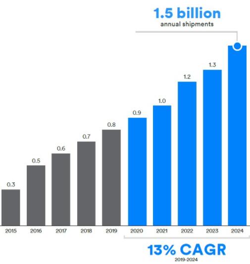 ● 音頻流應用包括:語音通話、收聽音頻/音樂、視聽設備、智能語音控制。2019-2024年增長率為7%,到2024年出貨量將達15.4億個。