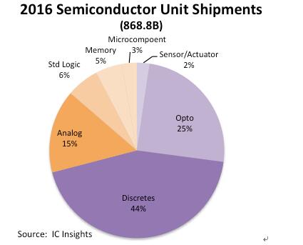 在2016年集成電路出貨量中,占比最高的是模擬集成電路,模擬集成電路占集成電路整體出貨量的52%,半導(dǎo)體整體出貨量的15%,下圖列出了2016年不同類別半導(dǎo)體出貨量的比例。