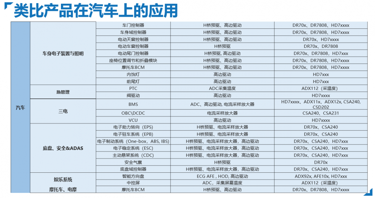 類比半導體高邊驅(qū)動產(chǎn)品可用于驅(qū)動車身控制域中的各種阻性、感性及容性負載的驅(qū)動,其在車內(nèi)外的應用非常廣泛,包括車內(nèi)飾燈、頭尾燈、座椅和方向盤及后視鏡加熱、電磁閥、門鎖、電機等場景。