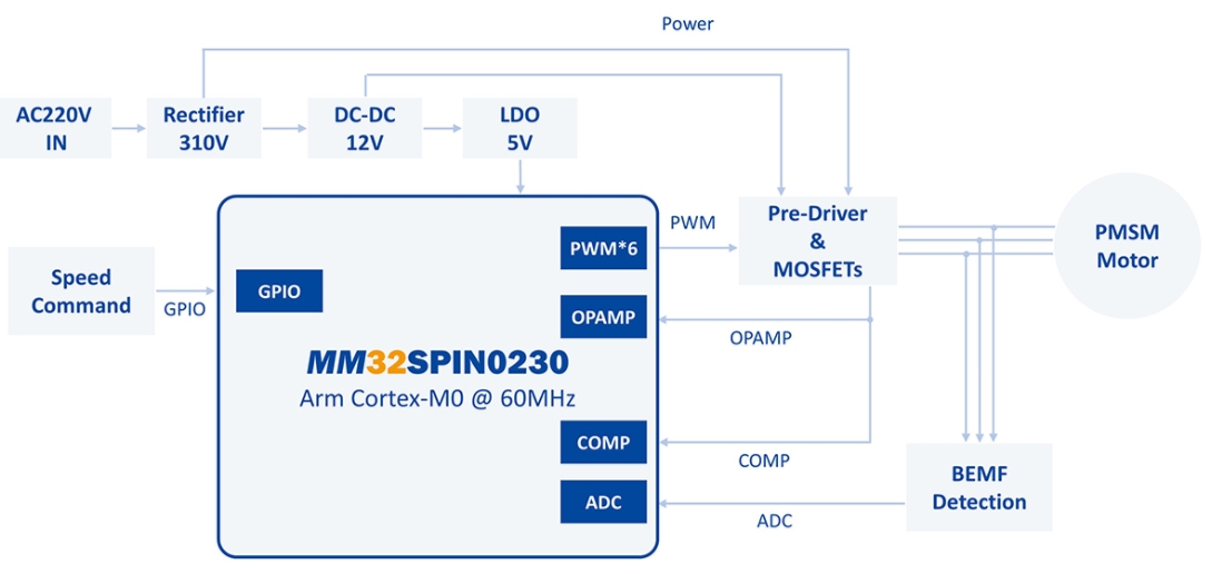 MM32SPIN0230,它采用Arm® Cortex-M0內(nèi)核,最高工作頻率可達60MHz,內(nèi)置32KB Flash和4KB SRAM,具備1路12位模數(shù)轉(zhuǎn)換器ADC,支持11通道,采樣速率達1Msps,以及4個通用定時器和1個專為電機控制設(shè)計的PWM高級定時器。此外,它還支持UART/SPI通信,并內(nèi)置2個運放、2個比較器,專為電機應(yīng)用而設(shè)計。