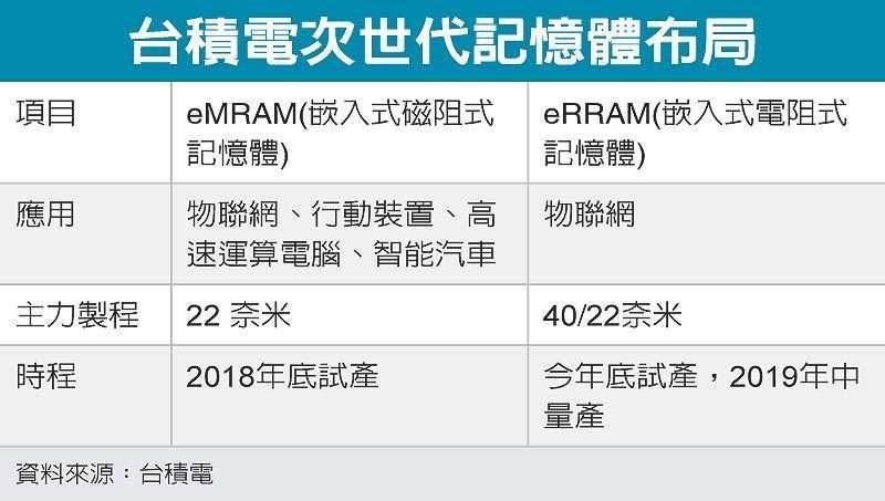 臺積電技術長孫元成近日在臺積電技術論壇上,第一次披露臺積電研發多年的eMRAM(嵌入式磁阻式隨機存取內存)和eRRAM(嵌入式電阻式內存),分別定于明后年實行風險性試產,主要使用22mn制程,這將是臺積電因應高速運算計算機、物聯網、行動裝置和智能汽車等四領域所供給效能更迅速和耗電更低的新內存。