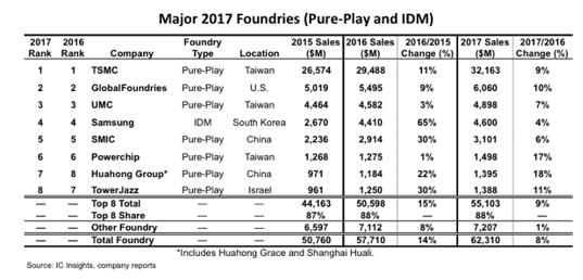 排在首位的臺(tái)積電2017年實(shí)現(xiàn)銷(xiāo)售額321.63億美元,同比增長(zhǎng)9%,以261億美元的差距超越第二位的美國(guó)廠商環(huán)球晶圓。在前八名企業(yè)中,三星是唯一一家IDM廠商(整合元件制造商),2017年晶圓制造業(yè)務(wù)銷(xiāo)售額為46億美元,排名第四。