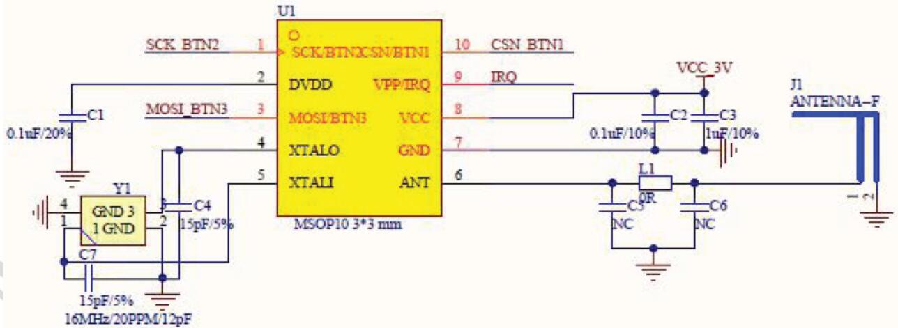 電源加兩個電容,如果用LDO 供電,分別取值1uF 和0.1uF 用以濾波;如果用紐扣電池供電,電容分別取值10uF和10uF 用以穩(wěn)壓。