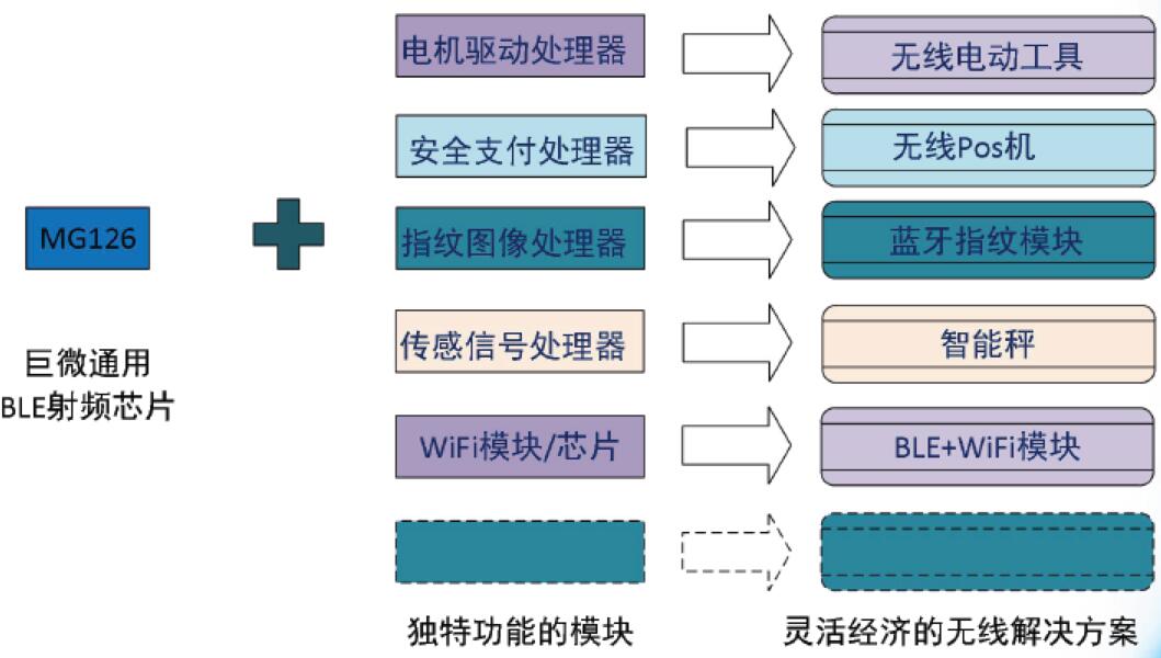 巨微MG126 是內部集成了發射機、接收機、GFSK 調制解調器和BLE 基帶處理的一款低功耗、低成本的BLE 收發器。MG126 采用QFN16 封裝,芯片大小為3mm x 3mm。搭配Cortex-M0 MCU 和少數外圍被動器件,可以實現BLE 遙控、藍牙鍵盤等數據傳輸應用。