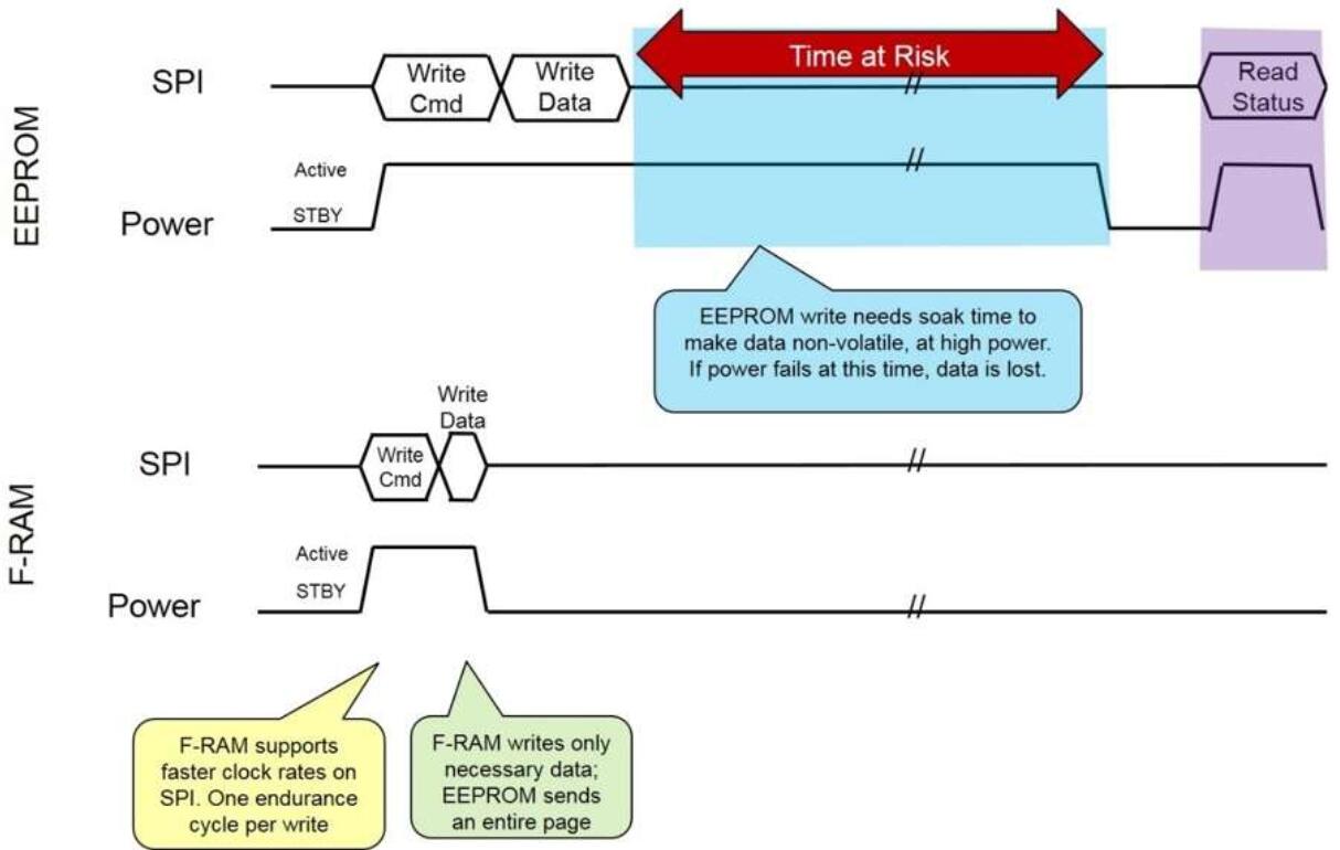 圖2:FRAM的快速寫入速度可保護(hù)使用EEPROM設(shè)備時(shí)可能丟失的關(guān)鍵數(shù)據(jù)。(來(lái)源:賽普拉斯半導(dǎo)體)