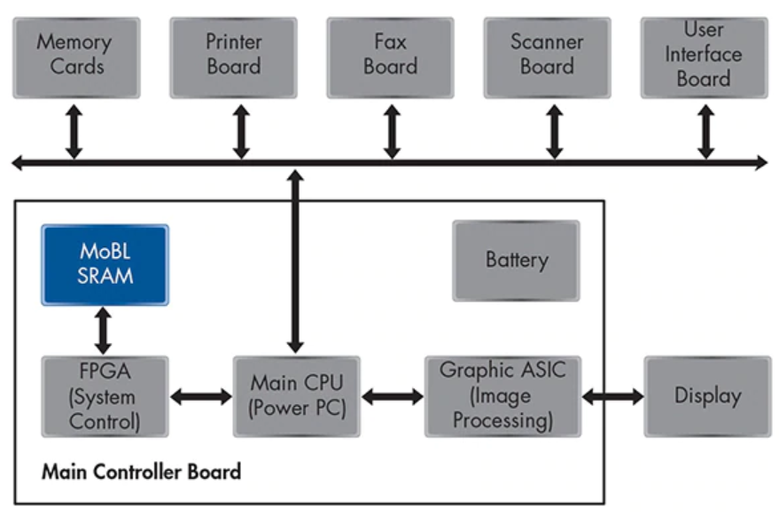 多功能打印機(MFP)是MoBL®SRAM器件的主要應用領域。多種數據永久或臨時存儲在MFP內存中。硬盤驅動器(HDD)或閃存驅動器存儲各種類型的用戶信息,而用戶工具設置,網絡設置和配置數據則存儲在專用的MoBL®SRAM中。SRAM還用于作業狀態和字體表。數據對于設備的運行至關重要,并通過電池的電源循環進行保護。因此,MFP設計需要具有高可靠性和低錯誤率的SRAM