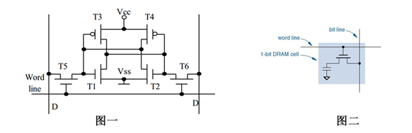 首先來看一張SRAM的基本單元結構圖(圖一),再來看看DRAM的基本單元結構圖(圖二)
